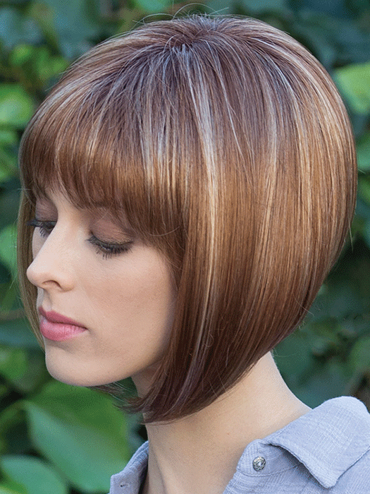 A dramatically angled bob with a tightly tapered nape and full fringe.