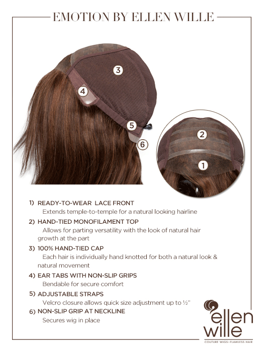 Emotion is a long Remy human hair wig with precision-cut layers that fall to and below the shoulder.The 100% hand-tied cap helps the layers blend beautifully to provide supremely natural movement. The monofilament top and hair density also contribute to the overall natural look of this wig. it's ideal for a petite to average head size. The 100% Remy human hair is the finest quality human hair -- exceptionally strong yet soft shiny and less likely to tangle as the cuticle is still intact and aligned. Emotion is part of the Ellen Wille Pure Power collection.