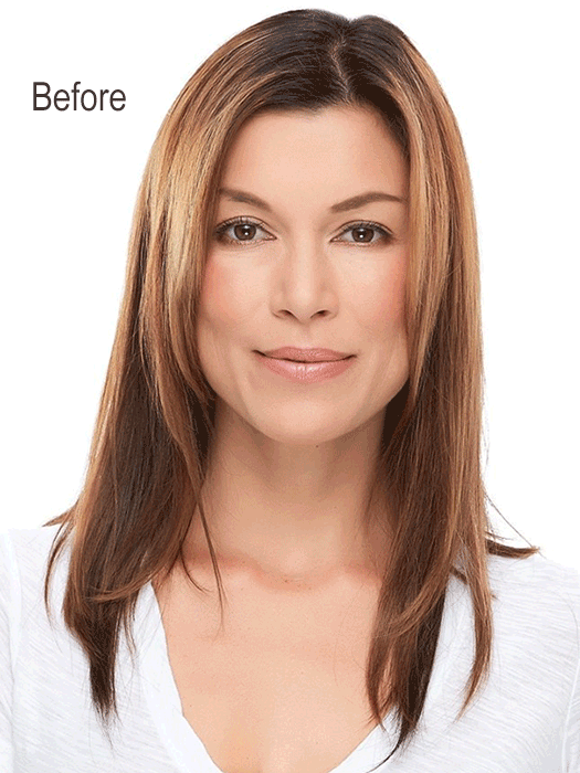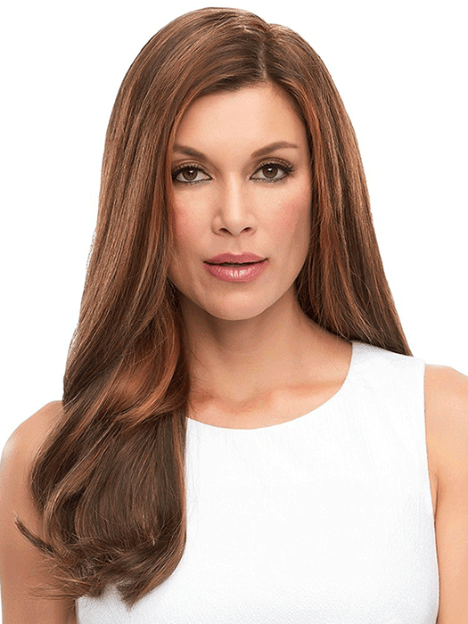 Designed with the comfort of a 100% hand tied stretch base this long Remy human hair volumizer is worn over the entire crown providing the most coverage of any clip in topper.
