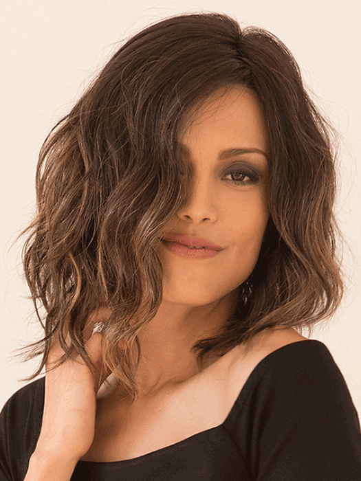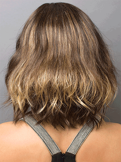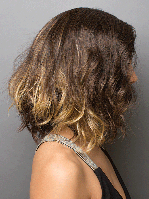 Salon finish beach wave curls fall shoulder length in this trendy bob with a new lace front monopart cap.