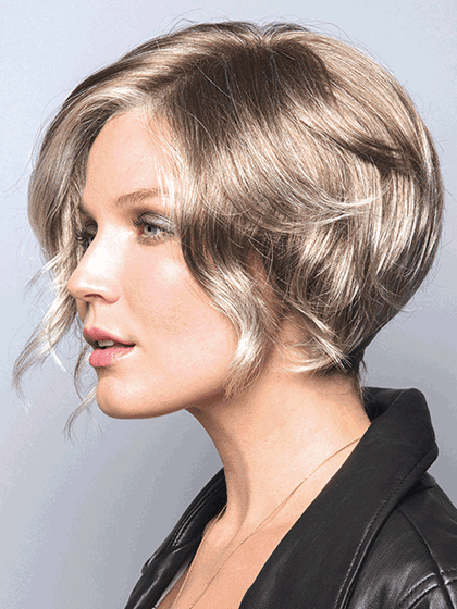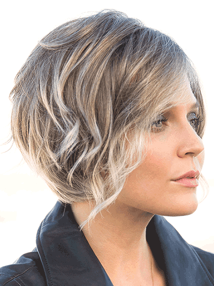 Sexy a-line cut with tapered nape and loose wavy layers that frame the face to the chin.