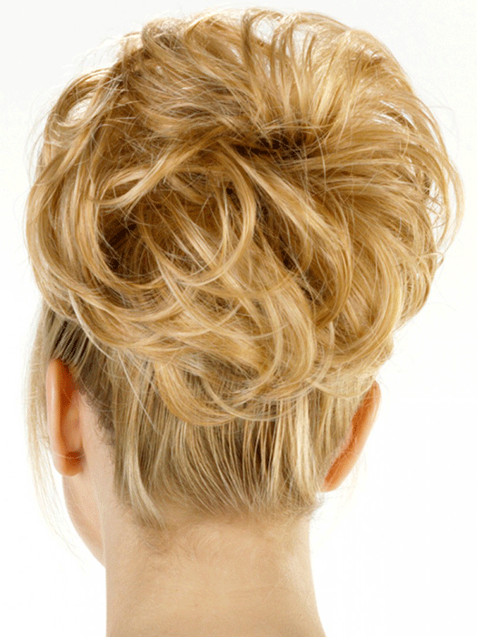Swirly is a twist-around hairpiece with a soft curve on a elastic band. Heat-resistant fibers can be re-curled re-styled or straightened with a temperature-controlled (up to 350 degrees) curling or flat iron. Can be worn either at the nape or the crown.